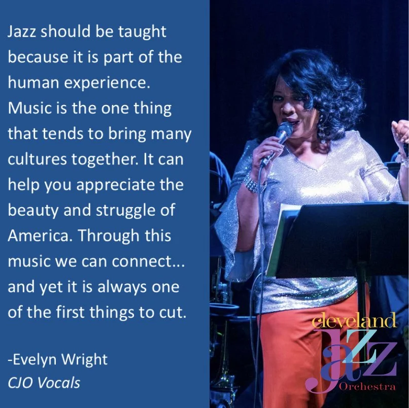The mission of the Cleveland Jazz Orchestra is to increase awareness and appreciation of jazz by engaging the community with original music, exceptional performances, and inspirational educational programming. Our growing School Residency program in Cleveland Metropolitan School District middle schools is inspiring the next generation of jazz musicians.
